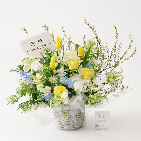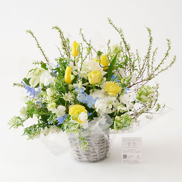 温かみのあるイエローとブルーのコントラストが可愛らしい春っぽいお供え花で、沈んだ気持ちを和らげます。