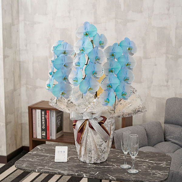 白の胡蝶蘭が満開になった時点でお花の表面をブルーとシルバーのグラデーションになるよう染色いたします。