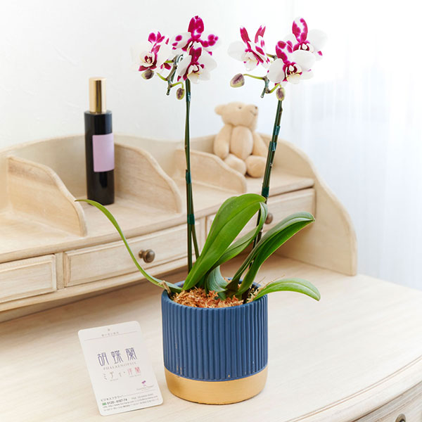 | 商品名 | ミニ胡蝶蘭 2本立 インテリア鉢「ロイヤルブルー」※花色ランダム |