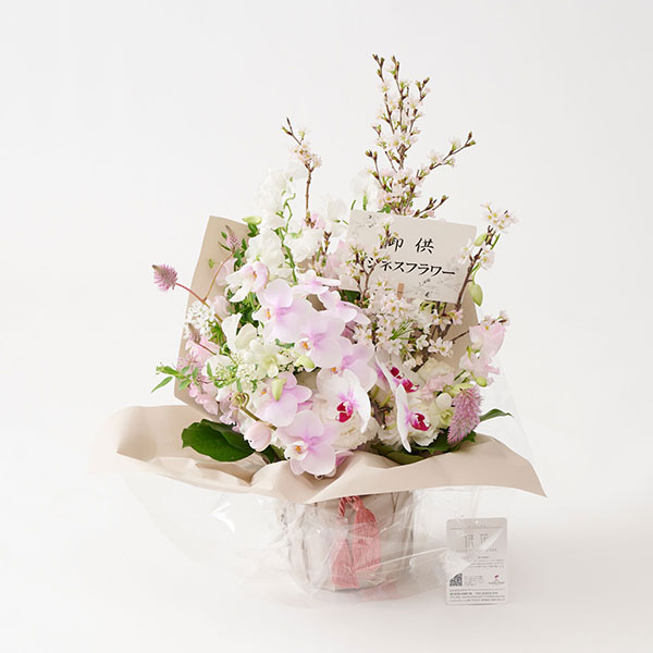 ピンク系の柔らかい色合いのお供え花で、沈んだ気持ちを和らげます。