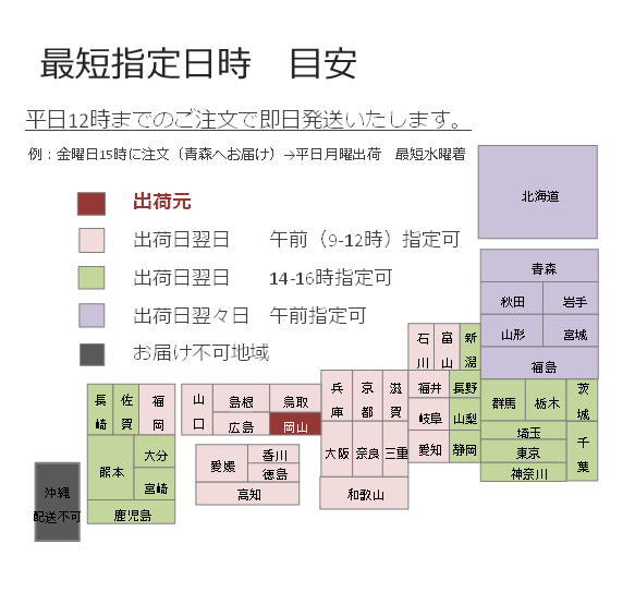 | 出荷元・お届け日時 | 岡山県 フローリスト 平日14時までの注文で翌日出荷 ※日時指定可・最短到着日は画像参照 |