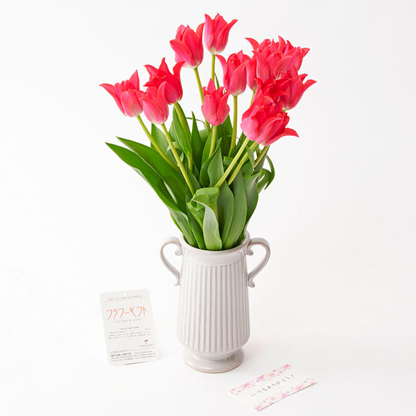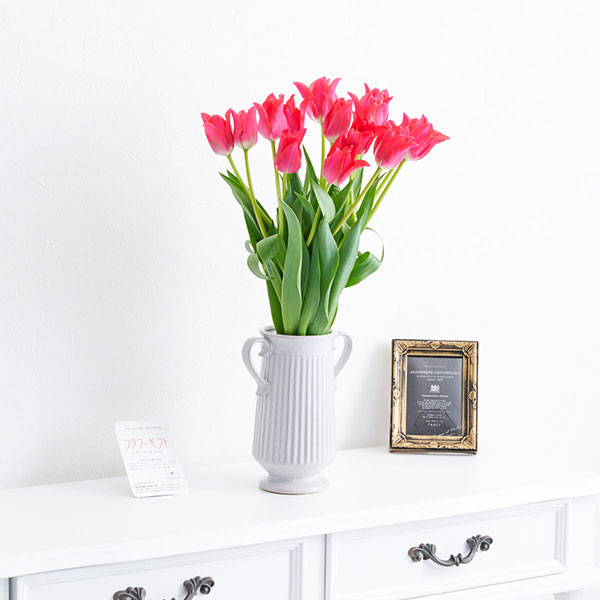 春を感じるチューリップの花束(ブーケ)とシンプルでおしゃれな花瓶のギフトセットです。