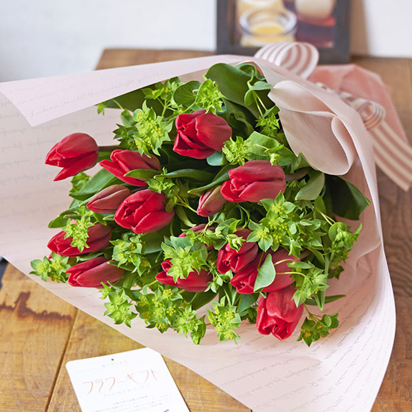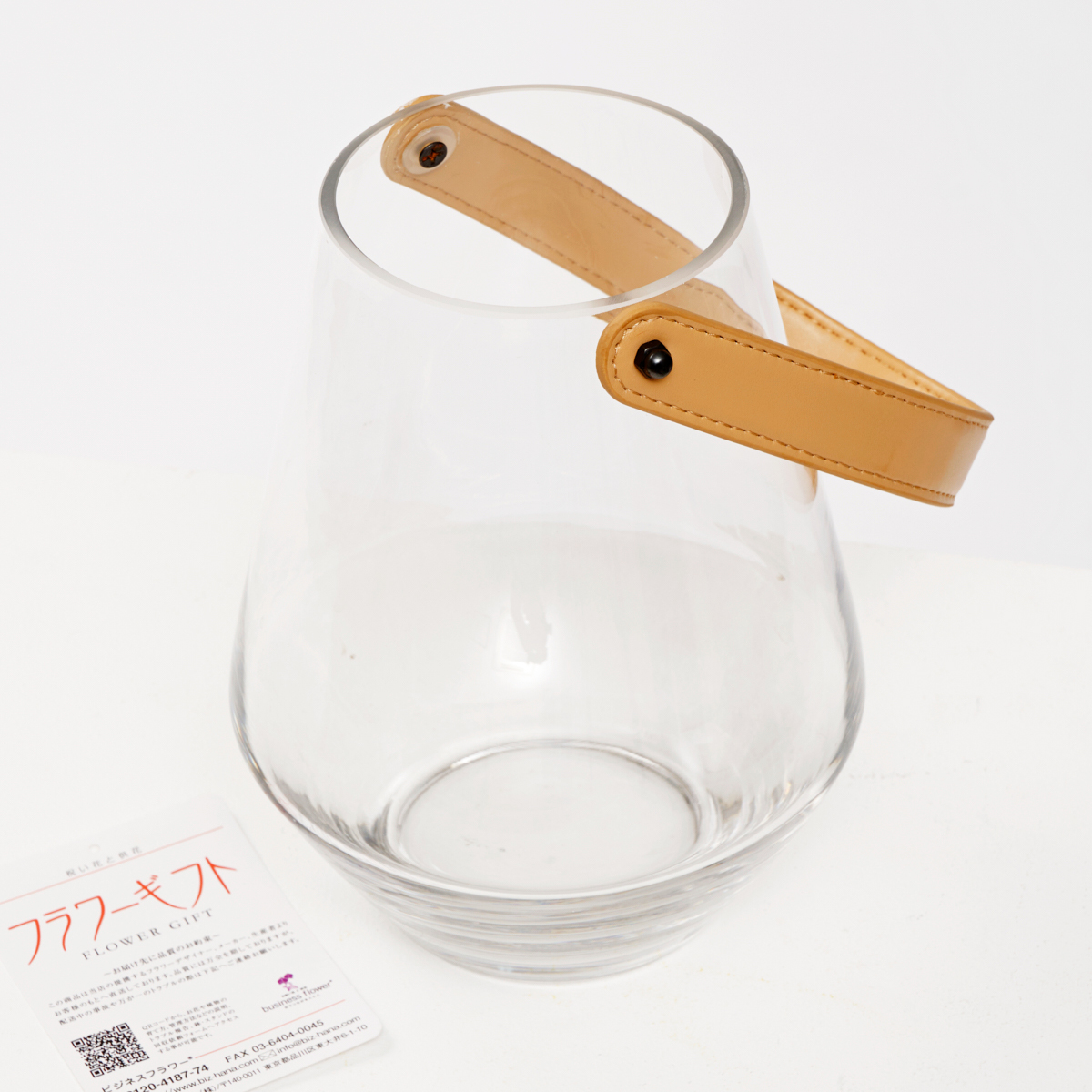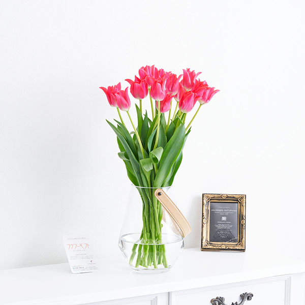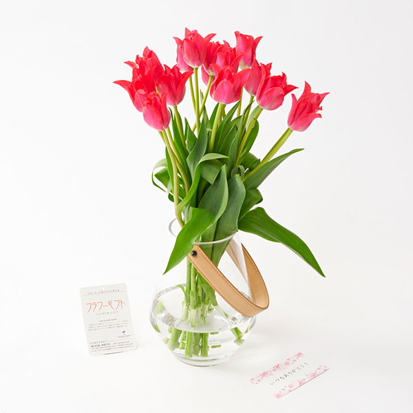 | 商品名 | 花瓶(レザー調ホルダー付きクリアガラス)とチューリップ 15本花束ブーケ(赤系) |