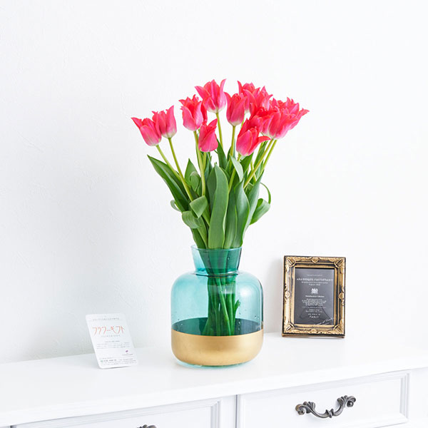 春を感じるチューリップの花束(ブーケ)と青とゴールドのコントラストがおしゃれな花瓶のギフトセットです。