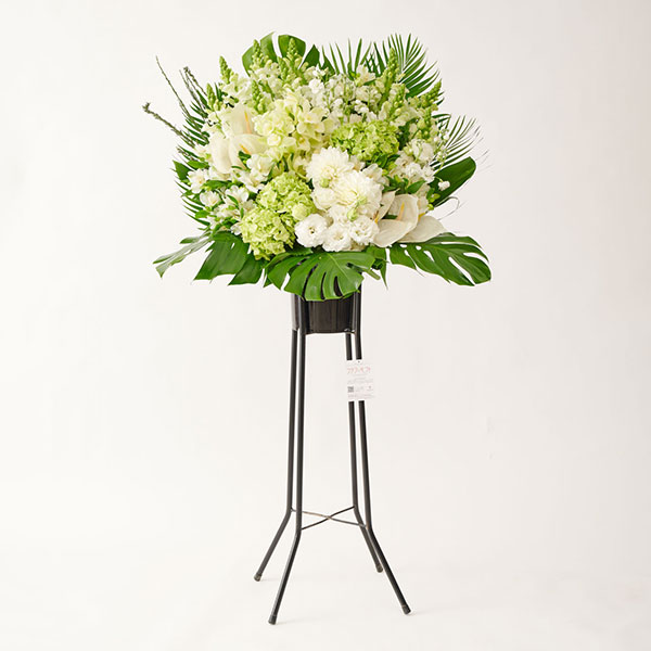 白やグリーン系の個性的なお花や、希少な花材を大胆に取り入れたデザイン性の高いおしゃれなスタンド花です。
