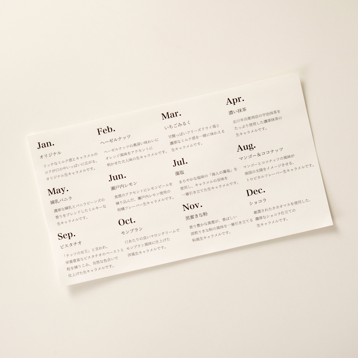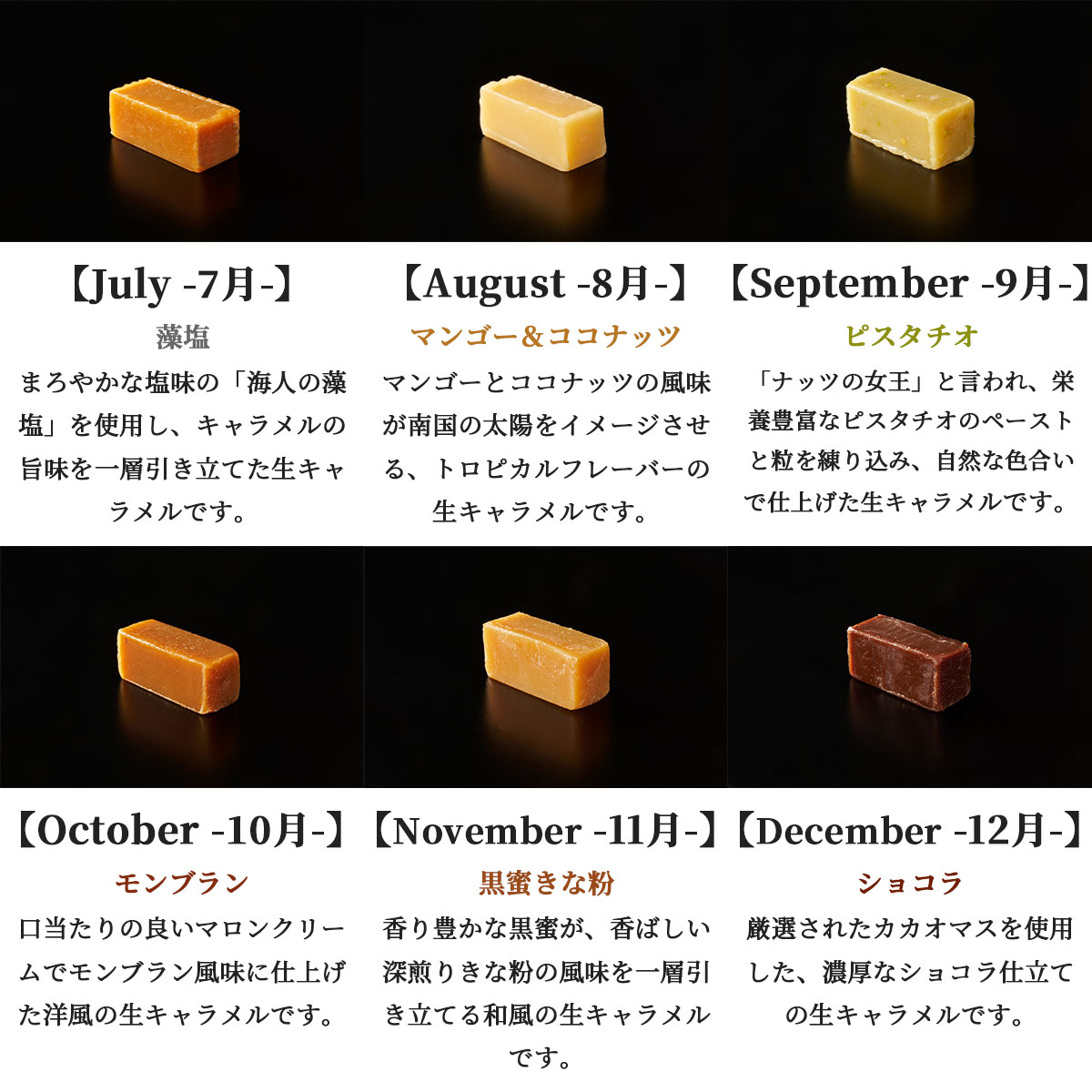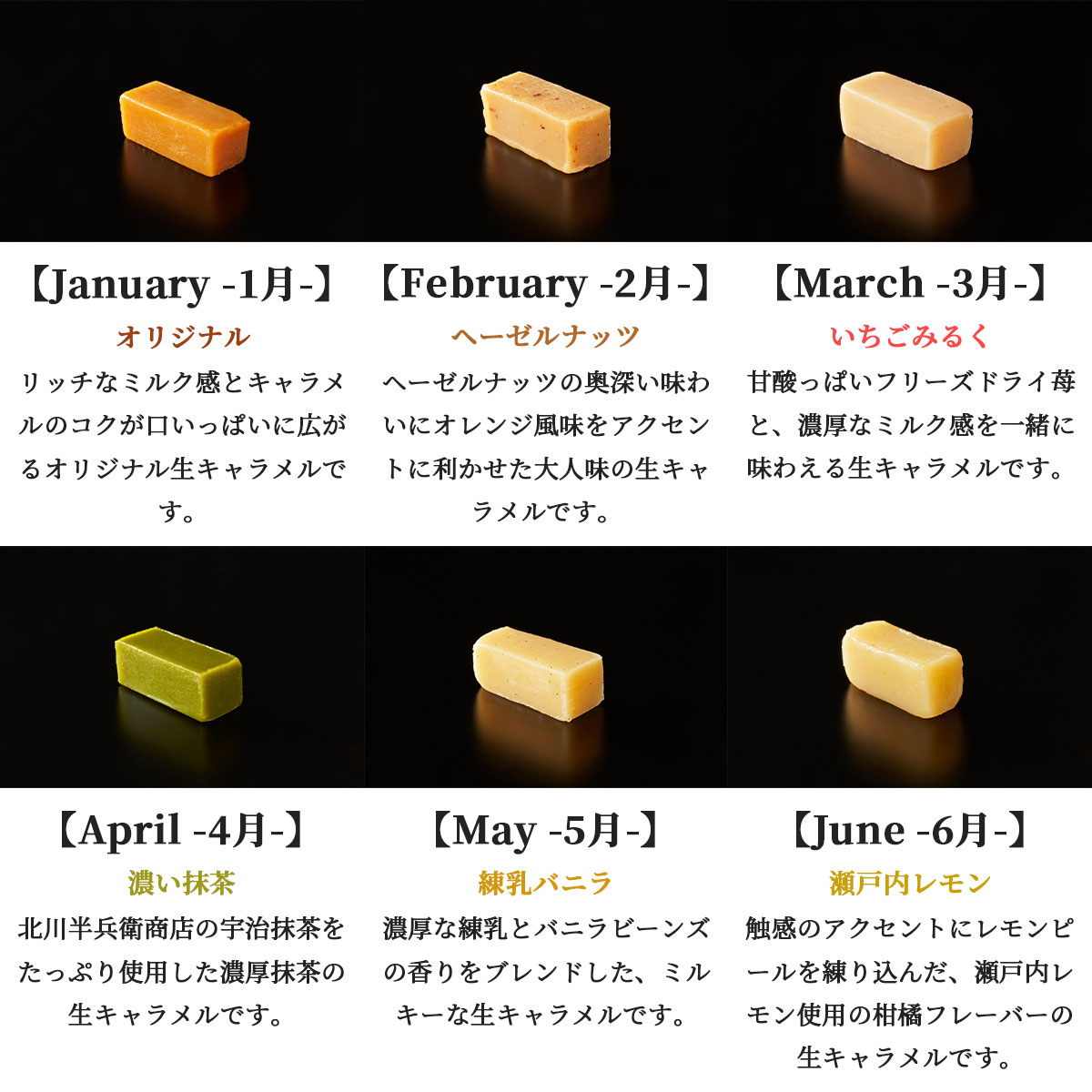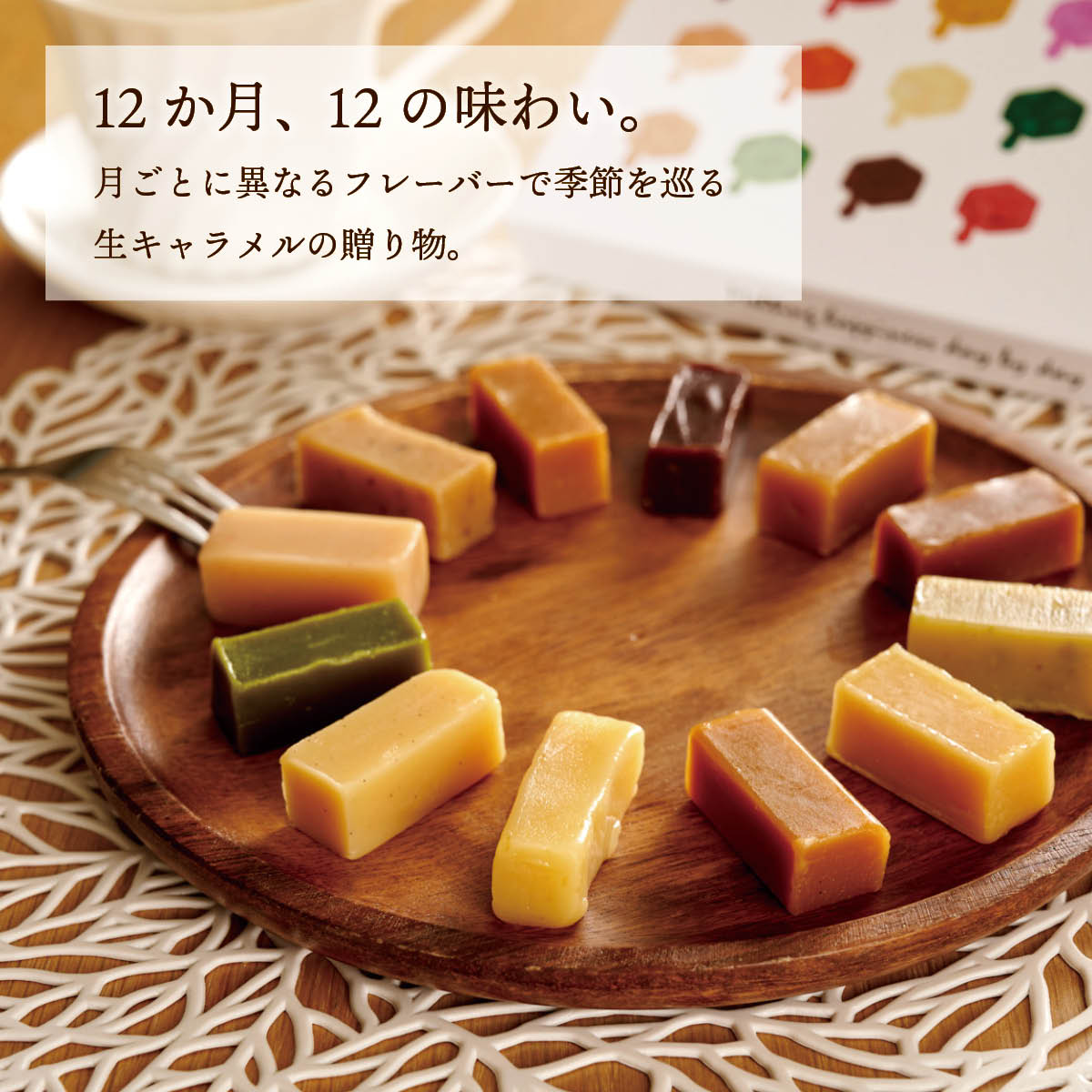 1月から12月まで、それぞれの月をイメージした12種の生キャラメルをお楽しみいただけます。